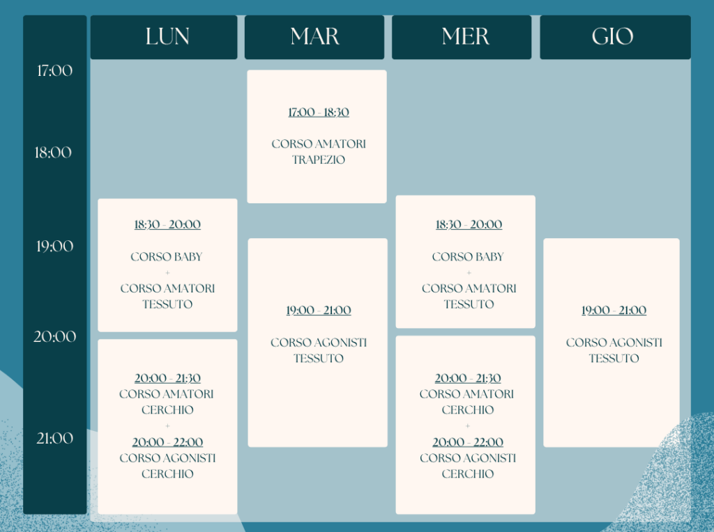 I tessuti aerei sono una disciplina basata su evoluzioni coreografiche che si eseguono sospesi in aria a diversi metri da terra, arrotolati dentro un lungo tessuto fissato al soffitto. Guardando le performance vertiginose degli artisti, verrebbe da pensare che i tessuti aerei non siano alla portata di tutti. Al contrario, possono essere praticati da chiunque, in adeguate condizioni fisiche, a qualunque età e senza rischi: prima di arrampicarsi ed esibirsi a diversi metri di altezza, si acquisisce dimestichezza con la disciplina a “bassa quota”, con materassi certificati che proteggono e attutiscono eventuali cadute.